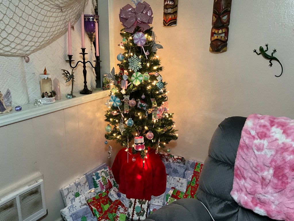 We put up our Christmas tree last night. It’s pastels mostly with a candy theme. It’s a little 4-footer on top of a milk crate. I’m all done with my Christmas shopping. I start early so I have a few paydays to spread it out….